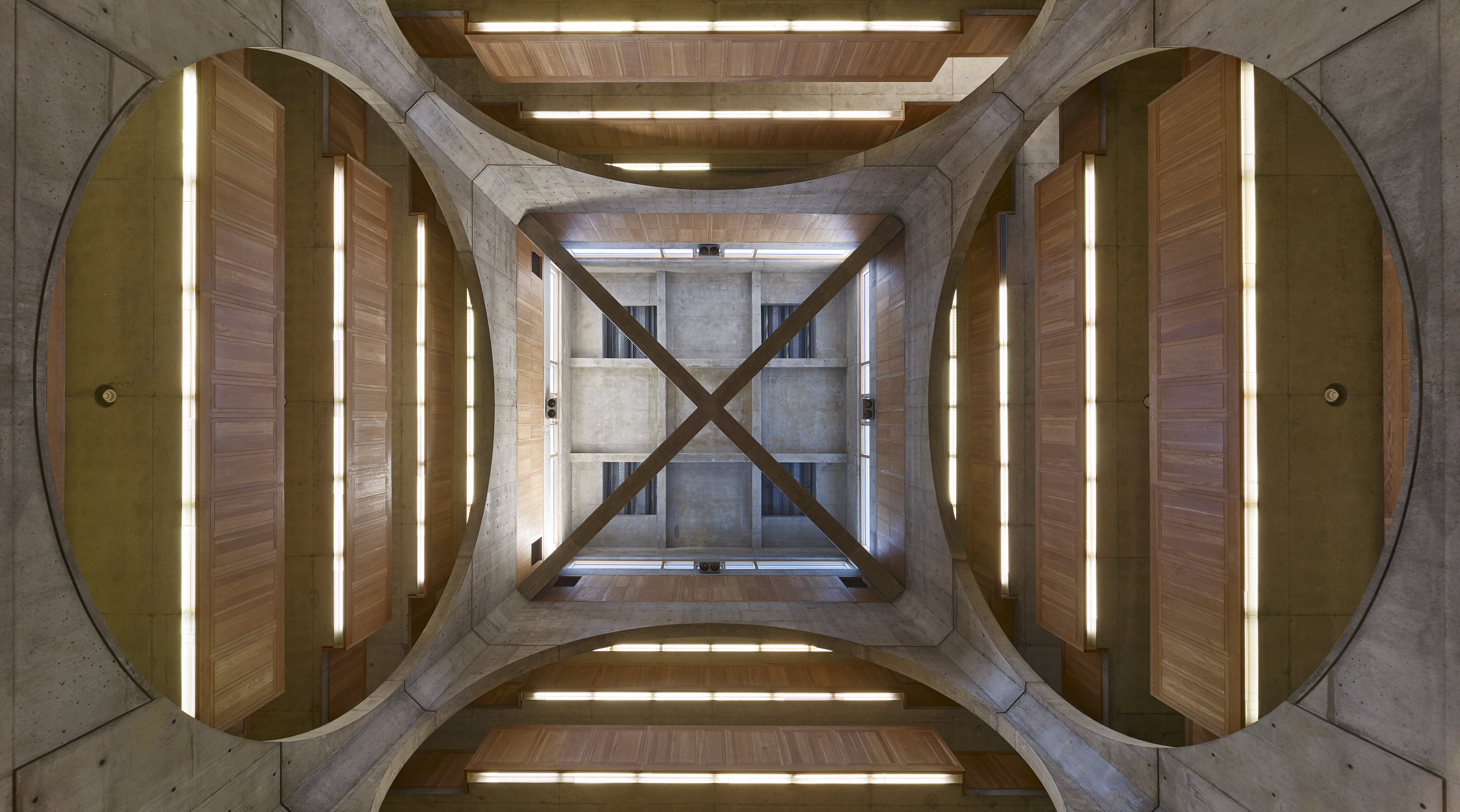 ცენტრალური ატრიუმი წარმოადგენს სივრცის მთავარ კონსტრუქციულ და ვიზუალურ ღერძს. იგი თითქმის სრული სიმაღლით იჭრება შენობაში და ოთხივე მხრიდან შემოსაზღვრულია მასიური ბეტონის კედლებით. ეს წრიული ჭრილები არა მხოლოდ ესთეტიკური ელემენტია, არამედ ისინი ამცირებენ მასის სიმძიმეს, ანაწილებენ დატვირთვას და ქმნიან ვიზუალურ გამჭვირვალობას სართულებს შორის.